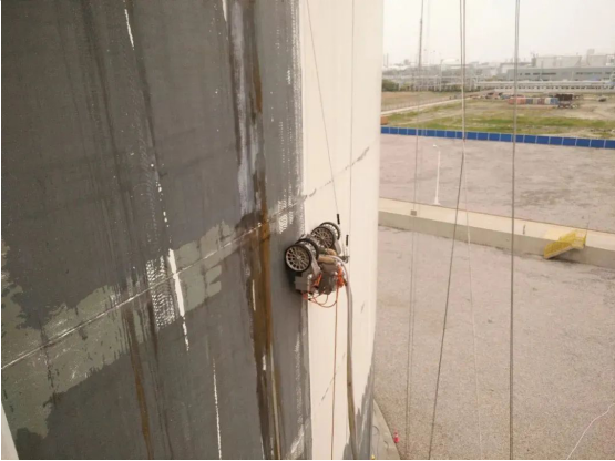 此次项目施工的难点在于去除罐壁面漆、部分中间漆和局部锈蚀的同时需要保留底漆和附着牢固的中间漆,这对于高压水打击力、移动速度等参数的设置、调整和操作提出了很高的要求。针对此次项目难点,史河化工绿色防腐除锈解决方案通过超高压水除锈,并搭载回收装置,实现污水实时回收。操作人员在地面远程操作机器人进行除锈作业,大范围降低了安全事故发生率。