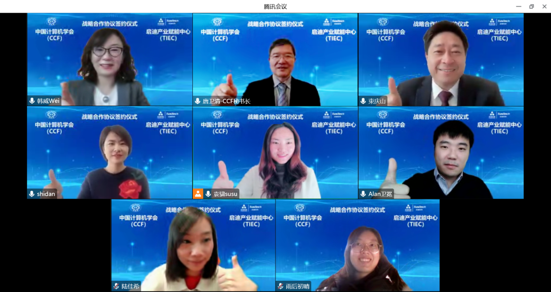 CCF业务总部&学术交流中心 执行总经理束庆山、CCF市场部主任石丹、启迪国际技术转移有限公司副总经理、启迪之星产业合作总监袁骕等共同参加签约活动。
